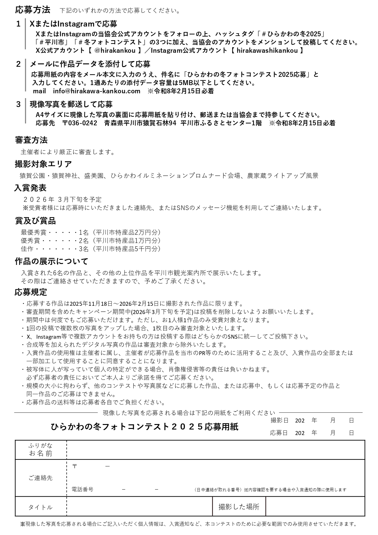 3つのハッシュタグ「#ひらかわの冬2025」「#平川市」「#冬フォトコンテスト」の3つを付けて投稿
