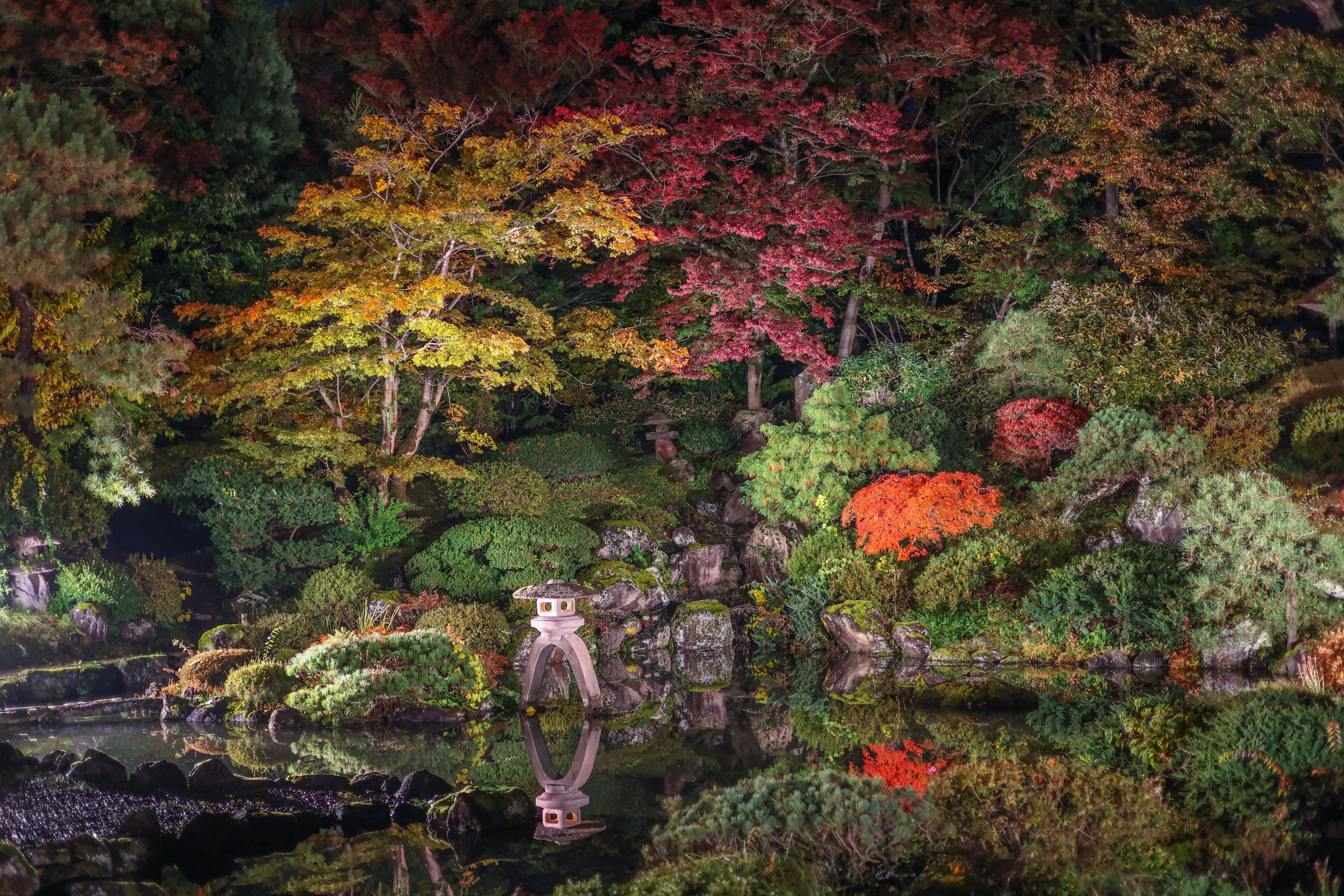 紅葉で彩られた錦のようなお庭を映し出す水面✨