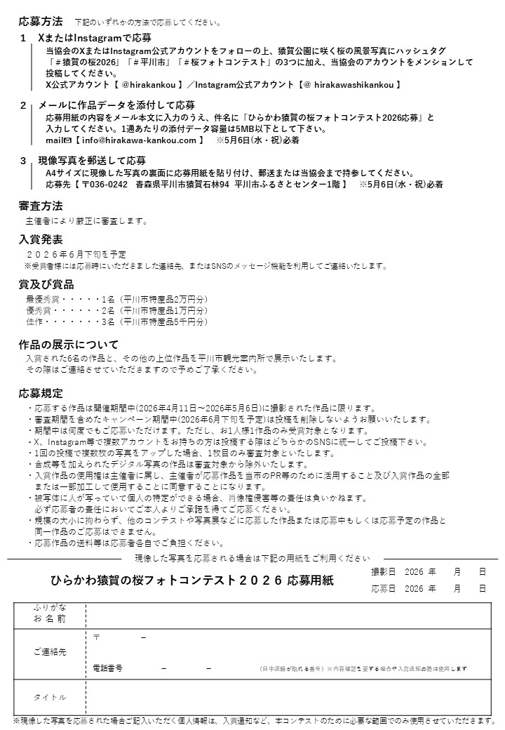 3つのハッシュタグ「#猿賀の桜2026」「#平川市」「#桜フォトコンテスト」に加え、当協会のアカウントをメンションして投稿