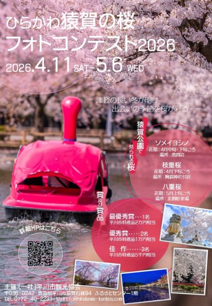 (一社)平川市観光協会では、皆様に平川市猿賀公園の桜の咲く風景を知っていただきたく「ひらかわ猿賀の桜フォトコンテスト2026」を開催します!